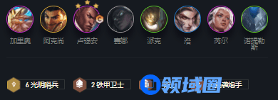 首先我们要确定阵容英雄选择是什么,英雄选择分别是加里奥,阿克尚,卢锡安,赛娜,派克,洛, 芮尔,泰坦,组成羁绊为六哨兵,二铁甲,二炮手