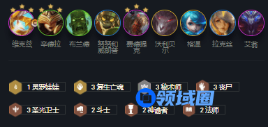 首先我们要确定阵容英雄的选择,英雄选择分别是大眼,辛德拉,火男,努努,稻草人,狗熊,格温,拉克丝,艾翁。组成羁绊为灵罗娃娃,三复生,三秘术,三丧尸,三圣光,二斗士,二神谕,二法师