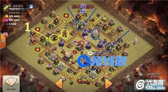 2、两狗加气球拆掉12点的防空塔后飞往3点的防空塔,顺道带走两塔之间的大鸟;同时3点下一狗和气球,拆掉3点防空塔后,狗球部队飞往6点方向的防空塔,途中收割第二个地狱塔。