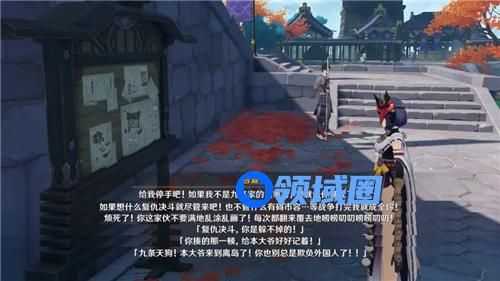 回复(天领奉行官员):诸位市民不必惊慌,天领方将尽快处罚涂鸦者。九条裟罗大人保证与此人毫无关联,敬请宽心。