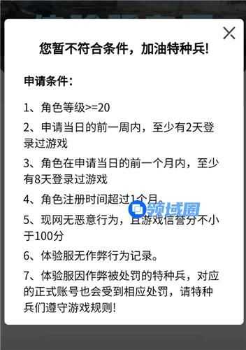如果你符合条件,就能成功申请到资格。但如果不符合条件,就会弹出下图所示的窗口,建议让正式服账号满足这7个条件后,再回来申请。