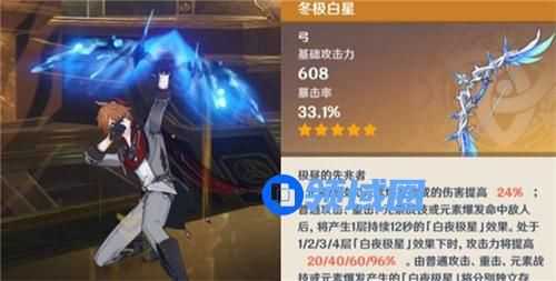 冬极白星不看特效的话,有着608的攻击力,和33.1%的暴击率,着33.1%的暴击率就已经很强了,是目前弓箭里面最高暴击率的,所以很适合玩家备用一把,毕竟暴击率在这个游戏中还是很重要的,大多数角色暴击率都是需要超过60的,而这个弓箭可以减轻圣遗物的暴击率压力,来叠加攻击力或者爆伤,而且大部分玩家现在都有公子,因此有公子的肯定是更加不亏。