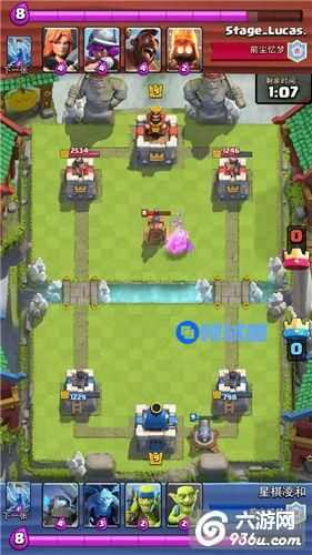 以一场实战为例,如下图。7级野猪先被3级毒毒了一秒,然后相当于和9级加农炮单挑。在3锤干掉加农炮之后,饮恨死在公主塔的箭下。而公主塔明显留有余力,就是说即使之前野猪没被毒到,和加农炮单挑也只是同归于尽的归宿。由于野猪的生命和加农炮的攻击都没有改变,就是说更新之后依然是这个结局。
