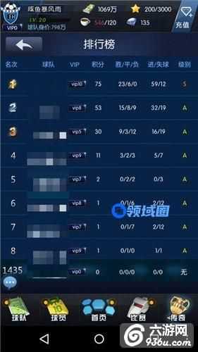 排行榜可查看本服实力前100名玩家,可查询信息包括VIP等级,联赛积分,胜平负,进失球,级别等。