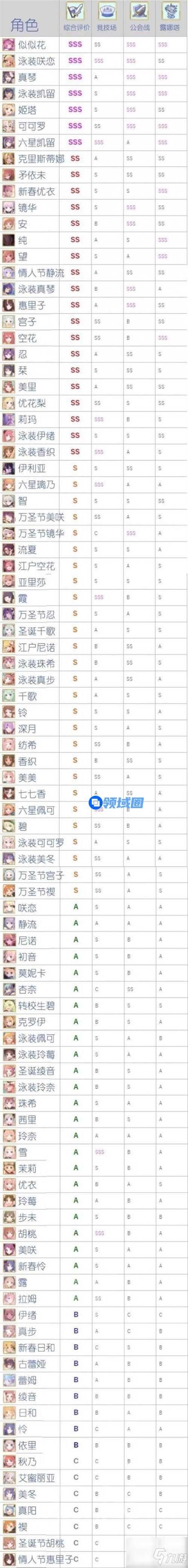 综合评价SSS:似似花、泳装咲恋(水电站)、真琴(狼)、泳装凯留(水黑)、姬塔、可可萝(六星)、凯留(六星)。
