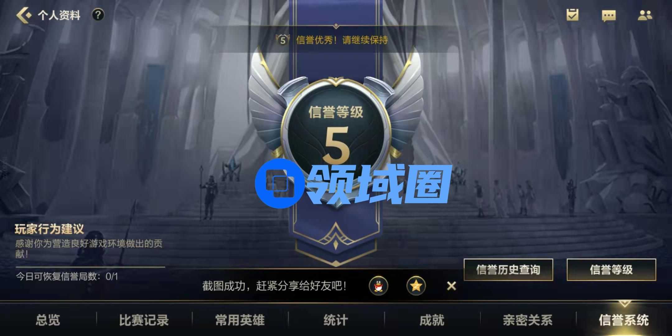 目前信誉系统一个有五个等级,我们初始等级为五级,四级和五级不会对我们的对局产生影响,不过一级到三级是无法参加排位,只能通过每天进行一局匹配,娱乐、人机来恢复信誉分。