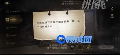 碎片线索是“皮皮鬼说这片碎片藏在扫帚,球,盔甲和长袍之中。”这个线索是需要到魁地奇精品商店寻找。