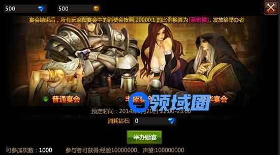 求婚成功后,夫妻可以举办一场婚礼宴席,并邀请全服的玩家前来祝贺。宴会中所有的收益,都将按照一定比例返还给婚礼的举办者。