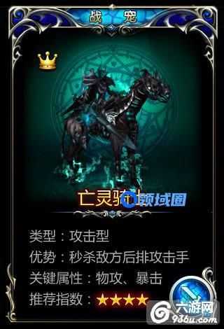 亡灵骑士在游戏中期是非常强力的战宠,作为攻击型战宠的他,有着极其出色的攻击能力。亡灵骑士的主动技能“破神斩”可以对敌方后排造成单体160% 的物理伤害,而且出手相当快,在战斗中可以抢占先机。在竞技场PK中,后排的位置一般是留给主力攻击手的,亡灵骑士的攻击即使不能秒杀对方的攻击手,配合 己方的群攻技能也能迅速击杀对方攻高血少的人物和攻击型战宠。亡灵骑士的圣痕搭配和所有攻击型战宠相似,极限的攻击、暴击、破格等属性是优先配备的。