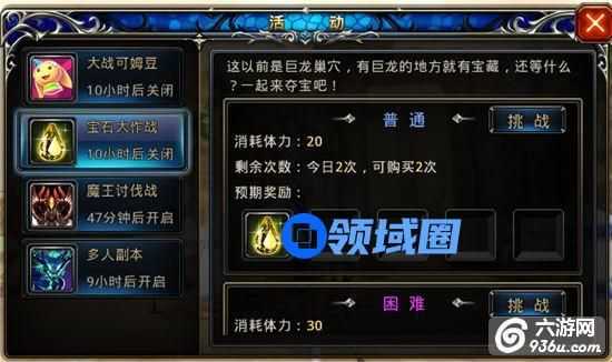 在副本中打倒怪物,会有一定概率掉落宝石,副本难度越高,掉落的宝石等级越高,宝石大作战难度分为三档,消耗体力也不同