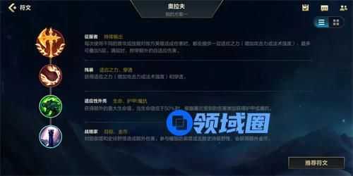 征服者:普攻和技能命中敌方英雄可以叠加层数,每层效果持续8秒,并且给予2-6攻击力或者4-12法术强度(基于等级)。叠满5层后,最多获得10-30攻击力或者20-60法术强度(基于等级),并且对英雄造成10%额外的自适应伤害。