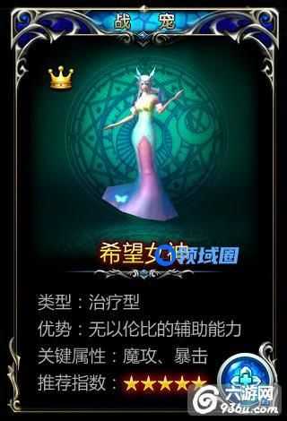 希望女神,不仅名字看起来很柔弱,战宠的本身的属性也并不突出。这样一个战宠中的“软妹子”,却屡屡出现在《神之刃》众多高玩的阵容中。仔细观察后我们就可以发现,希望女神对于团队的辅助能力无人能比,主动技能只能造成12%的群体伤害,却可以使得对方全体的被暴击概率提升50%;普通攻击可以恢复 己方受伤战宠的生命。无论是在攻击端,还是在防御方面,希望女神都可以给予团队超强的支持,是《神之刃》战宠组合中的第一辅助。