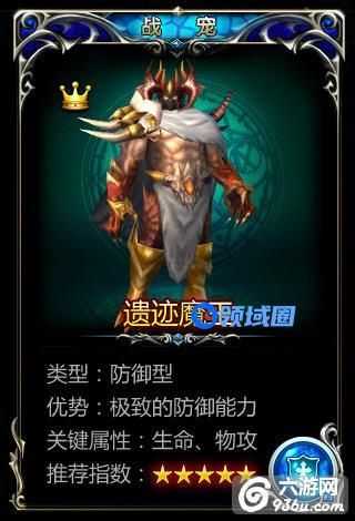 遗迹魔王,作为《神之刃》中的世界BOSS出现,需要全区玩家共同努力才能击败。作为一个防御型战宠,遗迹魔王有着极致的防御能力,堪称《神之刃》 第一防御宠。虽然主动技能的释放较慢,但144%的群体攻击一旦发动就是毁天灭地。被动属性提高的双防可以使得遗迹魔王在战场上的生存能力大大增强,足以成为敌人不可逾越的屏障。遗迹魔王的获取途径也很简单,只要坚持参加“魔王讨伐战”就能够获得魔王碎片,想要获得这个顶级战宠的小伙伴们可要加油喽!