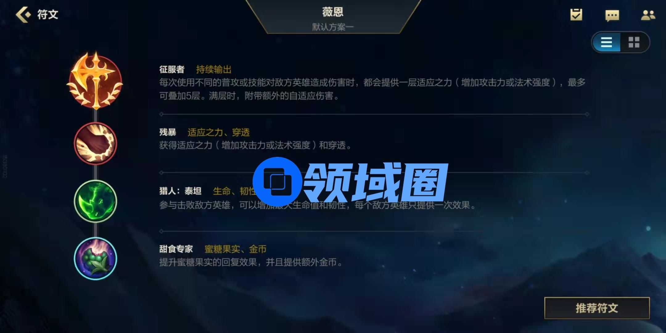 征服者:普攻和技能命中敌方英雄可以叠加层数,每层效果持续8秒,并且给予2-6攻击力或者4-12法术强度(基于等级)。叠满5层后,最多获得10-30攻击力或者20-60法术强度(基于等级),并且对英雄造成10%额外的自适应伤害。