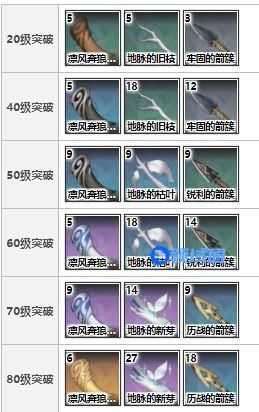 60级突破:凛风奔狼的断牙*5,地脉的枯叶*18,锐利的箭簇*14