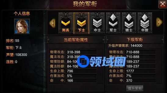 军衔勋章可提升角色的生命上限、攻击力、防御力和命中,后期可能需要消耗钻石进行提升。
