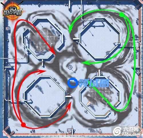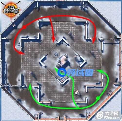 雪地四方阵的地形拥有众多高墙和拐角,玩家可以利用有利的地形,用墙体作为掩护,用拐角位置卡位,等待机会进行伏击。双方都可走中路直接切入靠近旗杆,但靠近旗杆必定会发生冲突,两翼属于掩护作用,所处位置都是处于既可以攻击中路靠近旗杆的对手,又能攻击对手掩护坦克的夹角射击位置,起到掩护中路夺旗坦克的作用。中路坦克行进很容易受到对手3方夹击,所以一定要利用旗帜附近正方形拐角地形,躲避炮火。