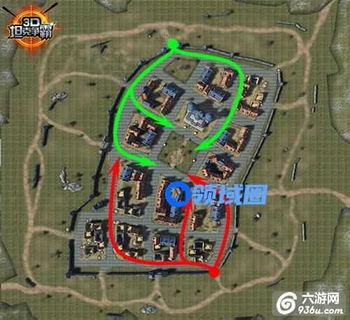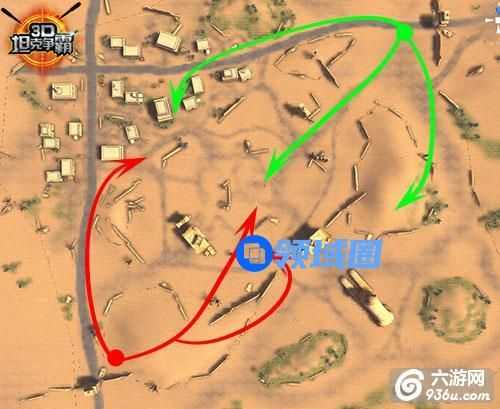 沙漠地图非常开阔,除了左上方的房屋外,几乎没有什么可做躲藏的地方,所以实际上真正玩的时候双方都并没有固定的路线。既然掩体少,就要充分利用,所以可以移动到左上角房屋箭头所在的建筑物旁。因为此处既能观察旗帜,又能攻击同样埋伏在建筑物之间的敌方坦克,所以很多玩家在开局时会抢占先机移动至左上角房屋区域。这些坦克主要则是用来掩护右路和中路占领旗帜。由于地形开阔,攻击力就成为了更为另外一个主要的因素。