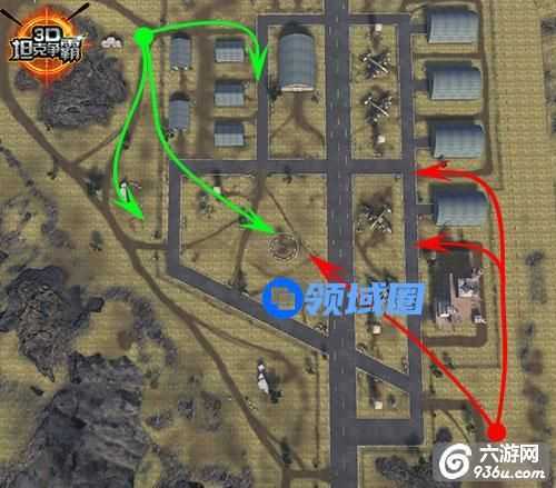 机场地图相对空旷,可作为掩体的建筑物并不多,所以不可避免的会发生正面冲突。尝试多次后,右侧飞机始终无法成为防御掩体,不能阻挡对方炮火,可以忽略不计,所以此地图交火点非常开阔。位于上方的玩家左右两路是作为掩护中路同伴坦克突围抢旗的重点,而处于下方的玩家,掩护的任务就是右路两辆躲避在建筑物中的坦克的任务,右侧两支箭头所处位置都能直接观察旗帜情况,所以可以二选一。由于地形空旷,被敌方炮火锁定后,移动躲避炮火的效果并不明显,这时候则需要调整坦克方向,正面对敌,防止侧方和后方受到攻击。