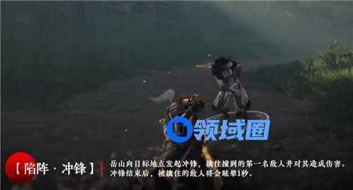 岳山高高跃起,向前方地面猛击,将落点周围敌人击退、并使陷入破胆状态。同时,岳山还会鼓舞队友,提升全队攻击力,持续8秒。