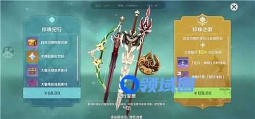 这个其实是不划算的,不推荐大家去买128,其实甚至不建议购买这个68的了,武器也不好,原石如果不差,为了680没必要去买这个纪行,拿一些普通奖励就行。