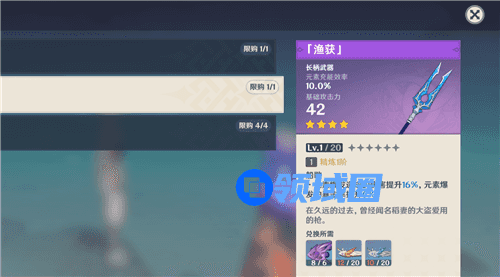 也就是大家常说的鱼叉,这把武器非常适合香菱,是目前版本最佳的四星武器,强度很高,有充能,并且还有元素爆发的提升,最重要的是这把武器可以白嫖满精,是性价比极高的四星长柄武器。
