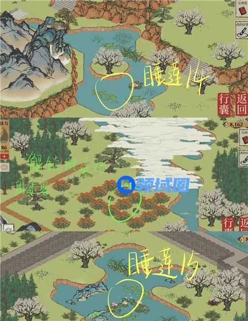1、繁花岛合欢树旁(砍掉摇钱树开宝箱有3朵睡莲)