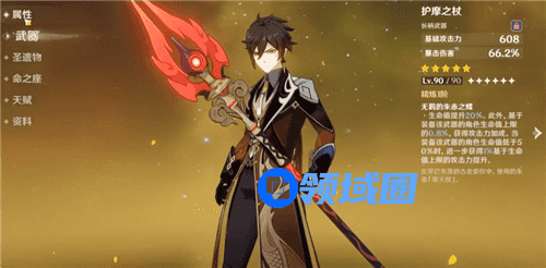 由于护摩之杖的属性太过于优秀,特效增加血量20%,对于钟离来说收益很大,然后就是护摩之杖的离谱面板,608攻击力,加上66.2%暴击伤害,基本上吊打所有长柄武器。