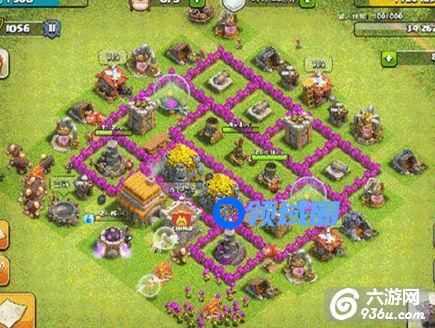 大家都知道六本是个很尴尬的位置, 城墙125个很难囊括所有建筑,也很难抵御七本后期的进攻。 这个阵型是我在多次调整后布好的,现在我来说下它的优缺点