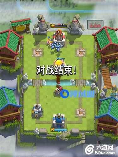 此时对手只能选择用箭雨打掉我残血的右塔,我直接皇家巨人放在正中间,去打对面的国王塔,最后火球飞在天上的时候游戏时间结束。