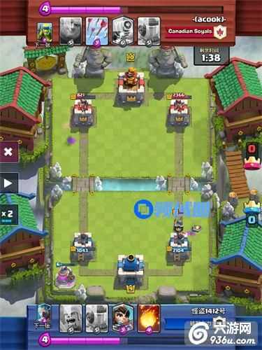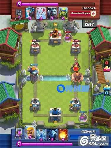 之后再用野蛮人将巨人砍死,形成一波反攻。野蛮人加冰法成功抵达对方右塔,一顿乱打之后拆了右塔。这时对手又在左路放了车跟冰法,这里我正好用野蛮人围住了车,所以还活着两个野蛮人。