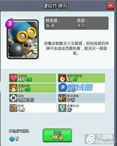 ②炸弹人:说实话,炸弹人是我在白卡中认为最好的卡牌之一,先不说它的移动速度和血量,就凭他的aoe伤害也够对方吃一壶。炸弹人主要是清理对方地面,缓解对方地面部队对土狗的伤害,也是加强对对方公主塔的伤害。想想有土狗当肉盾,跟着炸弹人的aoe,就这样有对一塔就轻松的拿到的可能。