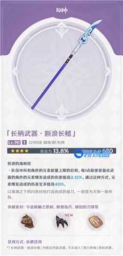 断浪长鳍适用于很多角色,主要是特效很不错,元素爆发提升,比如香菱,还有托马,以及大多数长柄武器角色,都是很适合的。