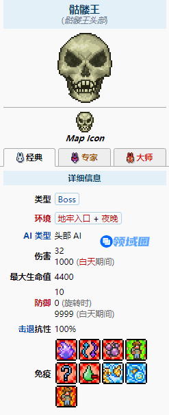 骷髅王是一个困难模式前的boss。玩家在进入地牢之前必须击败骷髅王,击败骷髅王可以让所有玩家在该世界获得任意进出地牢的权限。并且可以使服装商NPC在有空余房屋的时候入住。