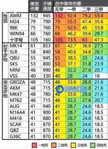 下图是穿各级甲时,被各种枪命中后受到的伤害。
