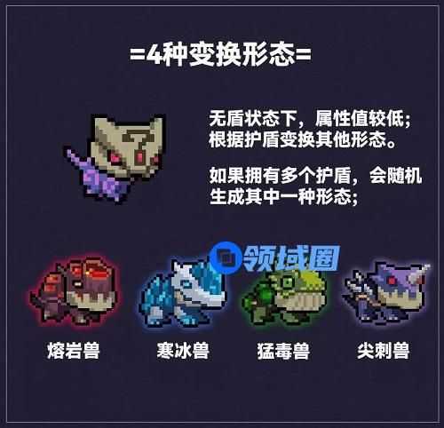 百变怪坐骑可以变身四种不同的形态,根据不同的护盾效果,它可以转化成熔岩兽、寒冰兽、勐毒兽、尖刺收等形态。