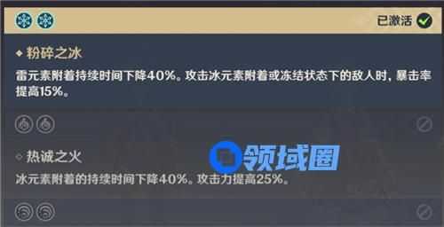 双冰效果:雷元素附着持续时间下降40%。攻击冰元素附着或者冰冻状态下的敌人时,暴击率提高15%。
