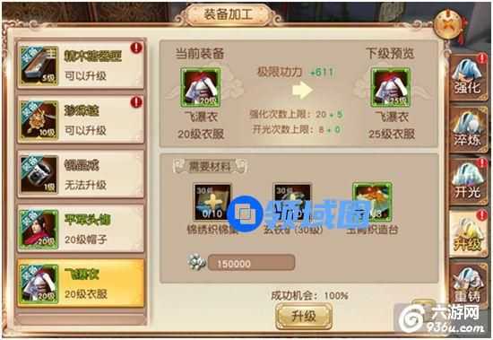 玩家通过搜集所需材料可将低等级装备转化成高等级,不同等级及品质的装备所需要的升级材料不一样