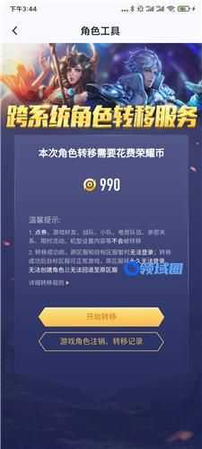 最后就会来到角色转移功能界面,点击【开始转移】花费990个荣耀币,就能进行账号数据的转移了。(PS:建议查看具体的转移规则,只有符合条件的账号才能转移。)