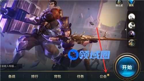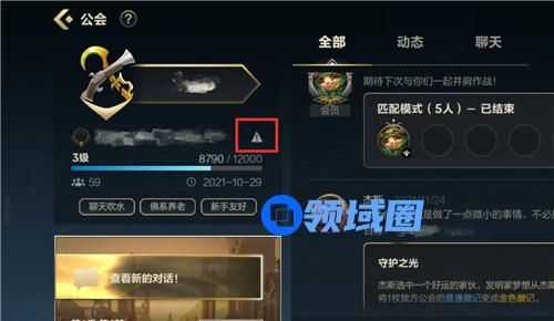 然后在公会这里找到公会名称旁边的一个三角感叹号标志,见下图,这个就是举报标志,点击。
