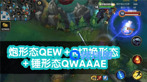 2、埋伏敌人时,锤形态EWQ进场,然后AAA就可以了,敌人逃跑了,就切换炮形态,直接QE打击。