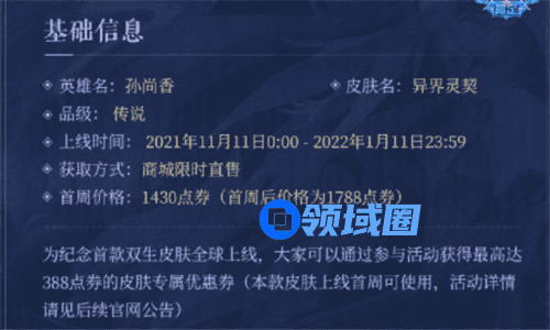 首周价格:1430点券(首周后价格为1788点券),为纪念首款双生皮肤全球上线,大家可以通过参与活动获得最高达388点券的皮肤专属优惠券。