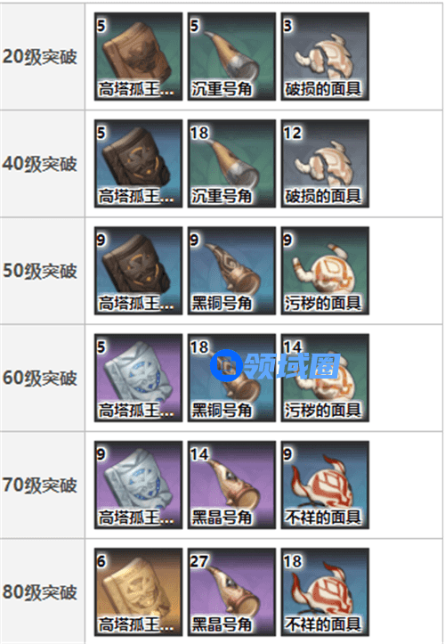 20级突破:高塔孤王的破瓦*5、沉重号角*5、破碎的面具*3