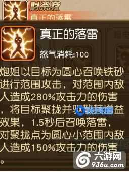 炮姐以目标为圆心召唤铁砂进行范围攻击,对范围内敌人造成280%攻击力的伤害,将目标聚拢并驱散其增益效果,1.5秒后召唤落雷,对聚拢点为圆心小范围内敌人造成150%攻击力的伤害。