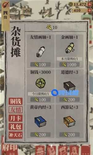 友情点其实就是一种货币吧,可以拿来兑换一些物品,例如:金画轴、友情画轴、道德经、铜钱、黄帝内经等等。