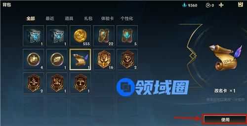 第二步:打开背包,选中改名卡,点击右下角的【使用】。