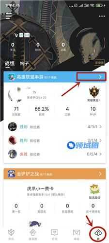 然后用QQ或者微信登录后,点击底栏最右边的“我”。如果这个号注册了英雄联盟手游的角色,就会显示近期的战绩,点击箭头进入LOL手游页面。