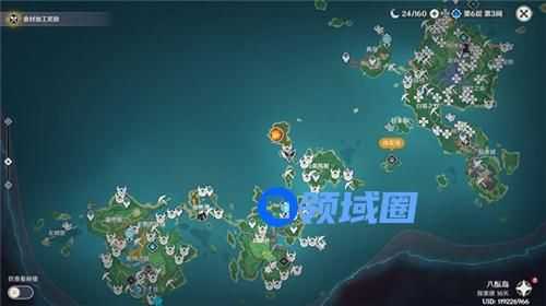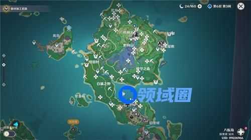 这篇攻略标注了绯樱绣球(四叶草标示)、紫晶石(锄头标示)、刀谭(魔物头标示)获取位置,见下图: