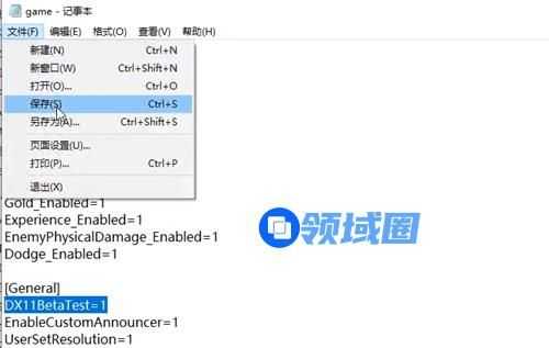 打开之后,找到[General]一列,添加一行“DX11BetaTest=1”的代码,如下图所示。改完了保存文件。