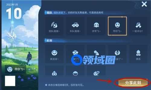 然后选中一个组队或者此刻的状态,来表达自己当前的心情,比如你现在手感很好,表示很想带队友飞,就选中带你飞的得意挑眉表情。